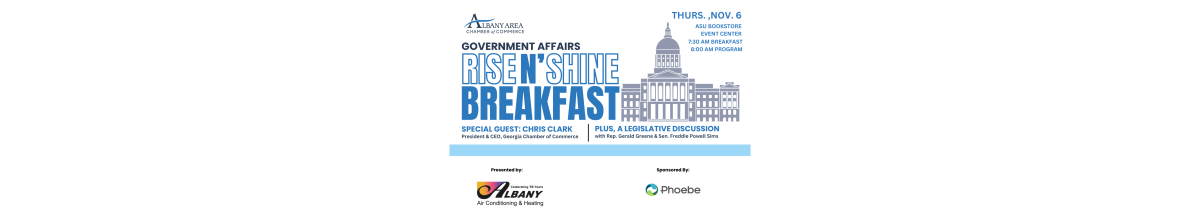 Join us for the 2025 Government Affairs Rise N’ Shine Breakfast, presented by Albany Air Conditioning, on Thursday, November 6. This signature event offers a preview of the upcoming Georgia Legislative Session, with important insights from the Georgia Chamber of Commerce and members of the Albany Area State Delegation.